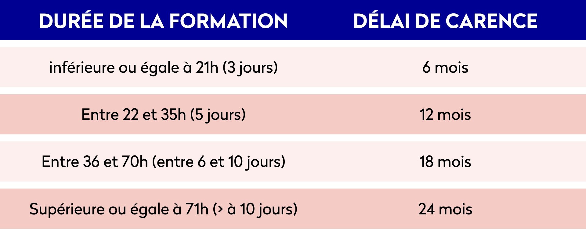 Ce délai démarre au dernier jour de la dernière formation réalisée, et sa durée dépend de la durée de cette dernière formation.
